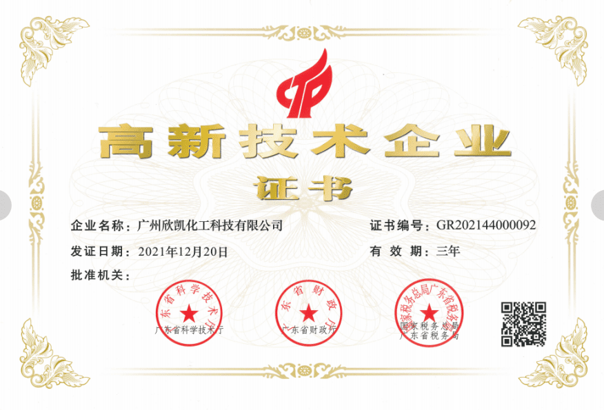 2021年12月,根據(jù)《高新技術(shù)企業(yè)認(rèn)定管理辦法》和《高新技術(shù)企業(yè)認(rèn)定管理工作指引》的有關(guān)規(guī)定。廣州欣凱化工科技有限公司榮膺“國(guó)家高新技術(shù)企業(yè)”。廣州欣凱化工科...More