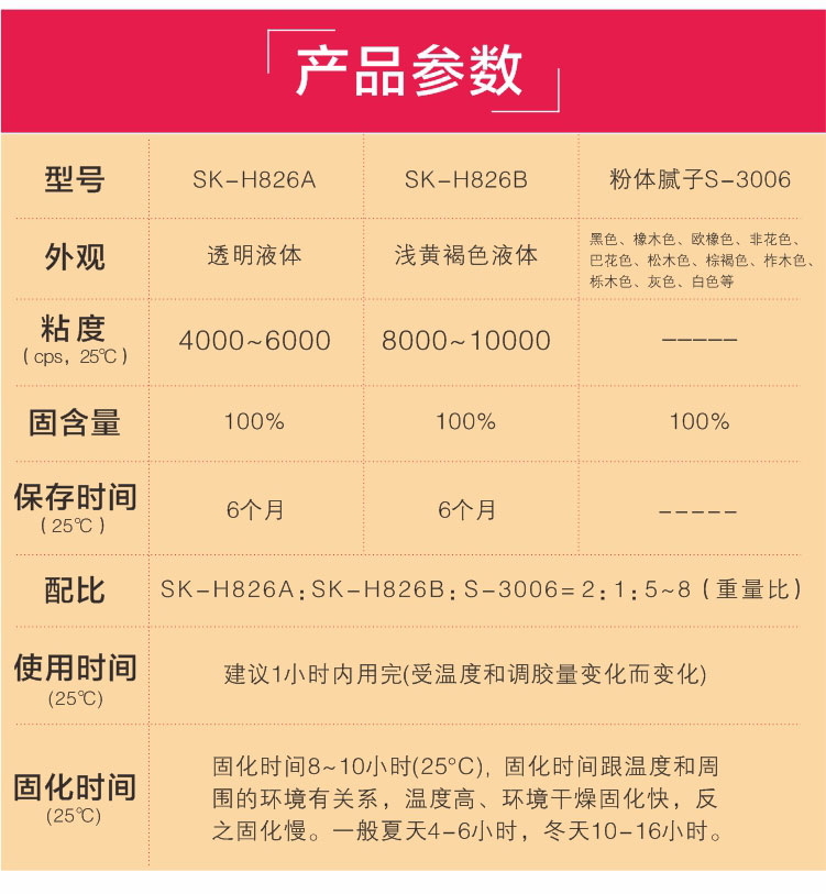 SK-H826AB膠粘劑是根據(jù)許多紅木家具、實(shí)木地板等其它木制品存在大節(jié)疤、大裂縫需要修補(bǔ)而特意研發(fā)的新型產(chǎn)品,不但具有很好的粘接性,并且混合以后具有一定的填充性。